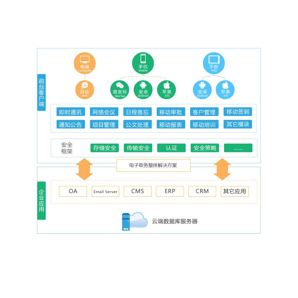 協助政府、企業單位將傳統的PC端的辦公系統(如電子政務、ERP系統、業務管理系統、OA系統、郵件系統等)進行定制移動APP開發,通過手機、平板等移動設備,實現所有員工的移動辦公、協同辦公、交互辦公,拓寬了企業管理者和員工的工作空間,提高決策速度和辦公效率,提升了企業的移動互聯網競爭力優勢。